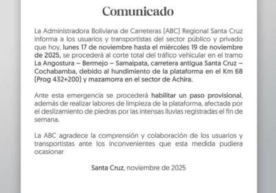 Cortada hasta el miércoles la ruta antigua Scz – Cbba. Por hundimiento de plataforma. Y po 17/11/2025