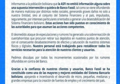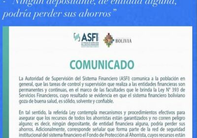 La ASFI llama a la calma y garantiza depósitos del sistema, sin mencionar al Banco Fassil