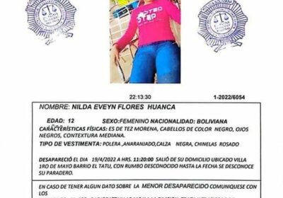 Buscan a Nilda Eveyin Flores Huanca de 12 años, quien fue vista por última vez en su domic… 20/04/2022