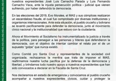 Comité Cívico y municipios de provincias convocan a acompañar a Luis Fernando Camacho este… 09/07/2022