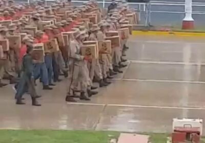 ATENCIÓN Fuerzas armadas chavistas marchan sosteniendo cajas de comida. E…